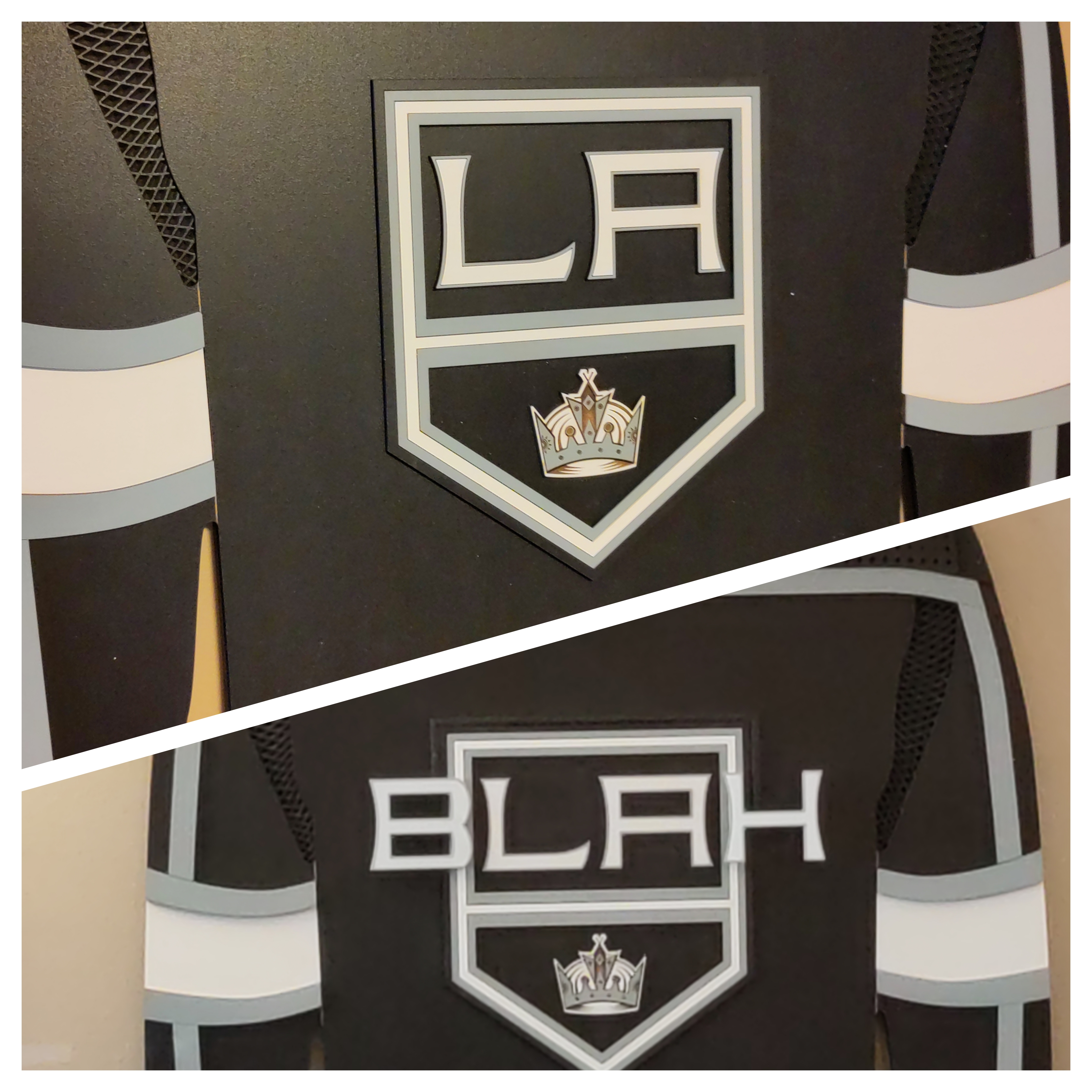 My son-in-law is a rabid LA Kings fan. Knowing this, my daughter bought him this nifty memento, which he keeps on the wall of his man cave so he can point to it and crow whenever they score. Very annoying. It was a situation begging for a bit of creative adjustment…